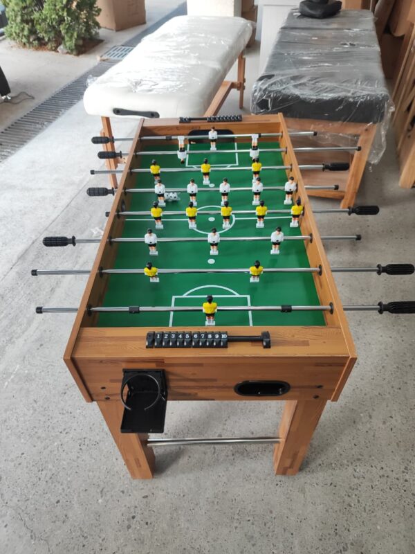 ხის კონსტრუქციაზე დამზადებული ფეხბურთის მაგიდა, გამძლე მეტალის სახელურებით და სტაბილური სტრუქტურით. იდეალურია სახლისთვის, ოფისისთვის ან გასართობ სივრცეებისთვის. კომფორტული სახელურები და გლუვად მოძრავი ლიანდაგები უზრუნველყოფს სასიამოვნო და დინამიკურ თამაშს.