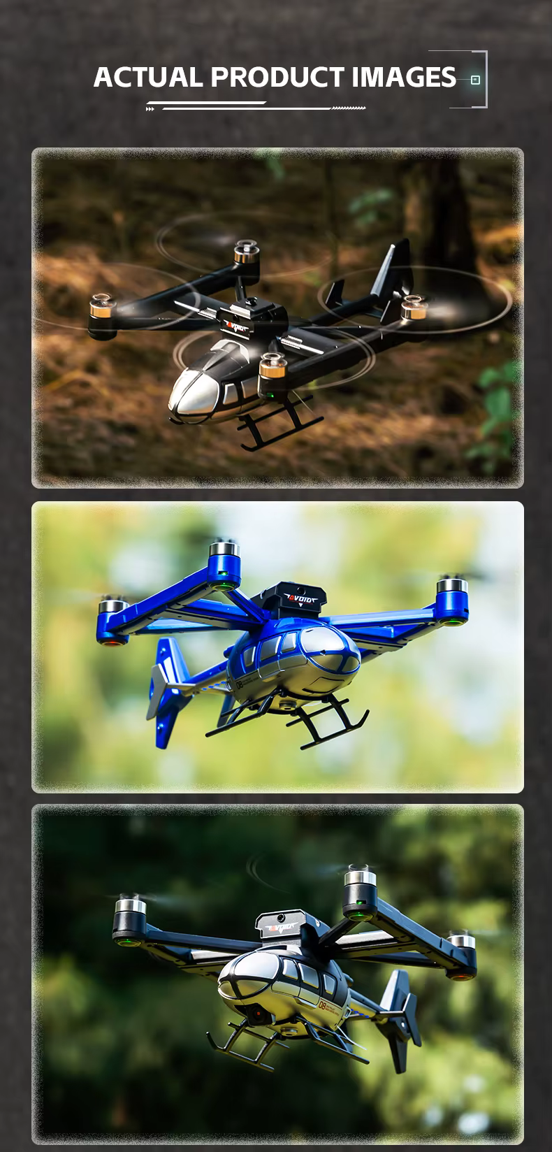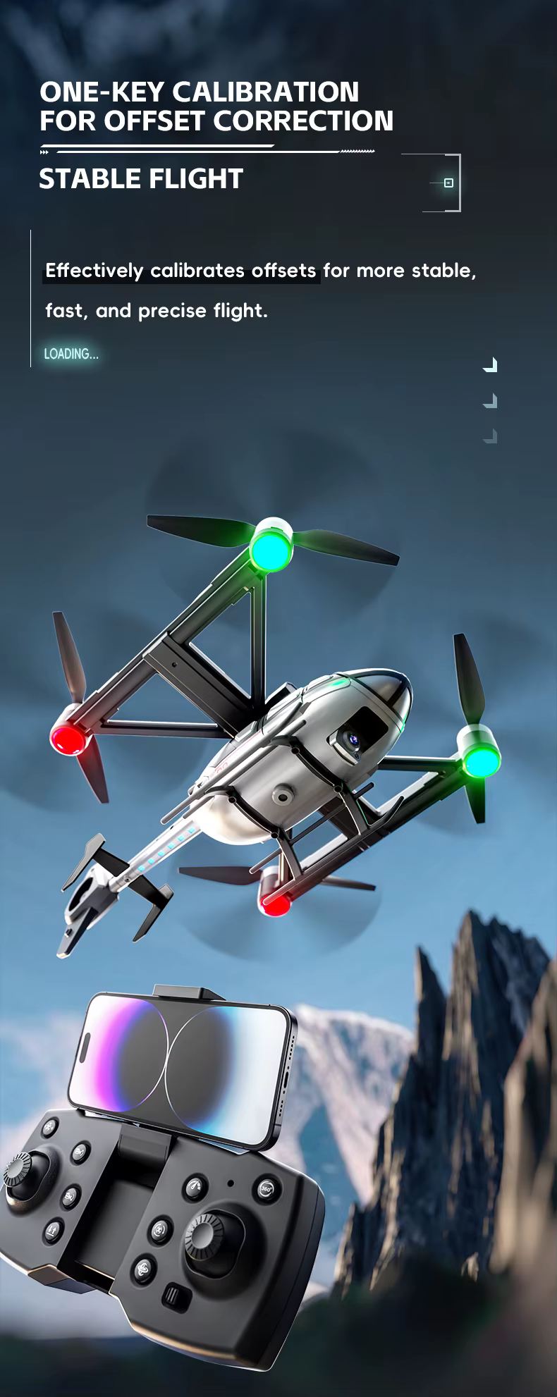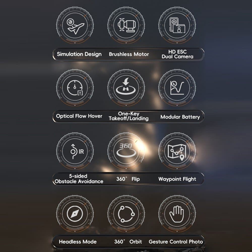 ფრენის ფუნქციები – ერთი ღილაკით აფრენა/დაშვება, 360° შემობრუნება, ფრენა თავის გარეშე, სწრაფი და ნელი სიჩქარე